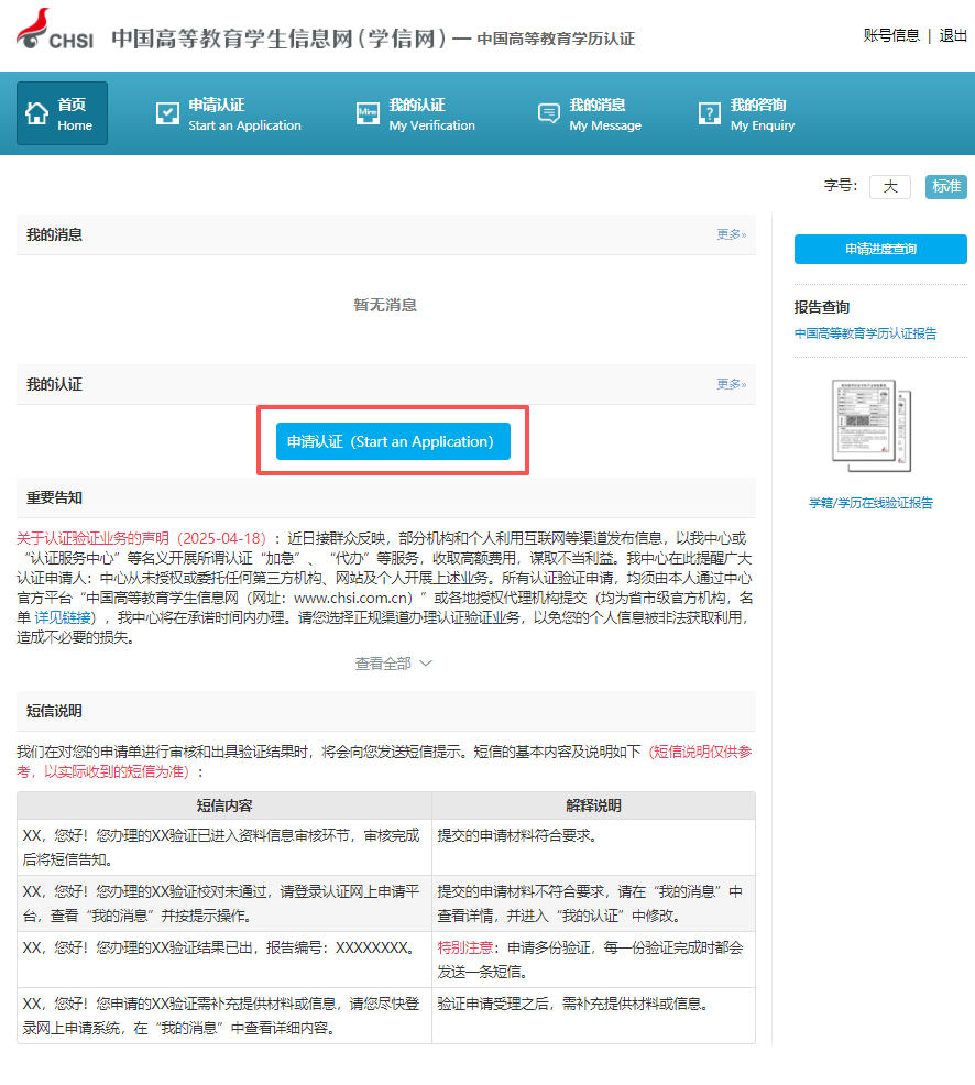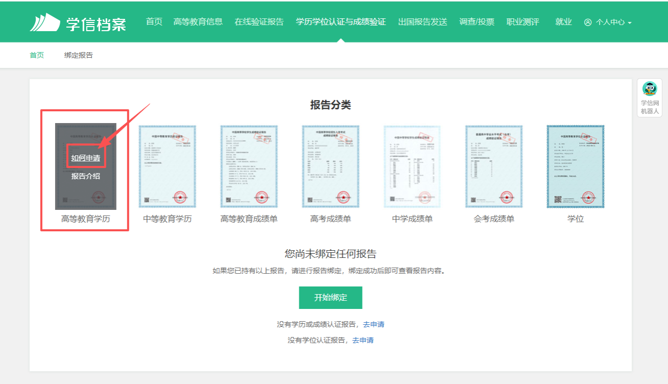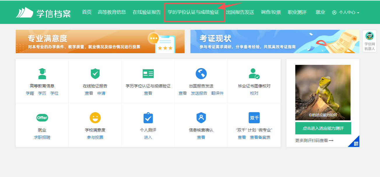 第二步:点击上端导航栏“学历学位认证与成绩验证”进入首页。