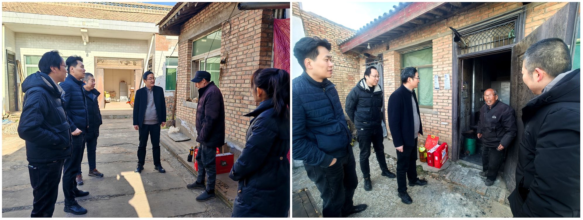 随后,在挂职和驻村干部的陪同下,丁昌峰一行分别前往学院结对帮扶对象肖和平和薛忠孝家中,为他们送上了精心准备的米、油、牛奶、坚果和棉鞋等生活物资,仔细检查了两位老人的生活条件与取暖设施,细致询问了他们的健康状况、家庭收入及冬季生活保障等具体情况,叮嘱他们注意防寒保暖与用火用电安全。两位老人对学院的关心表达了感谢,并表示会保持积极乐观的心态,把日子过得越来越好。