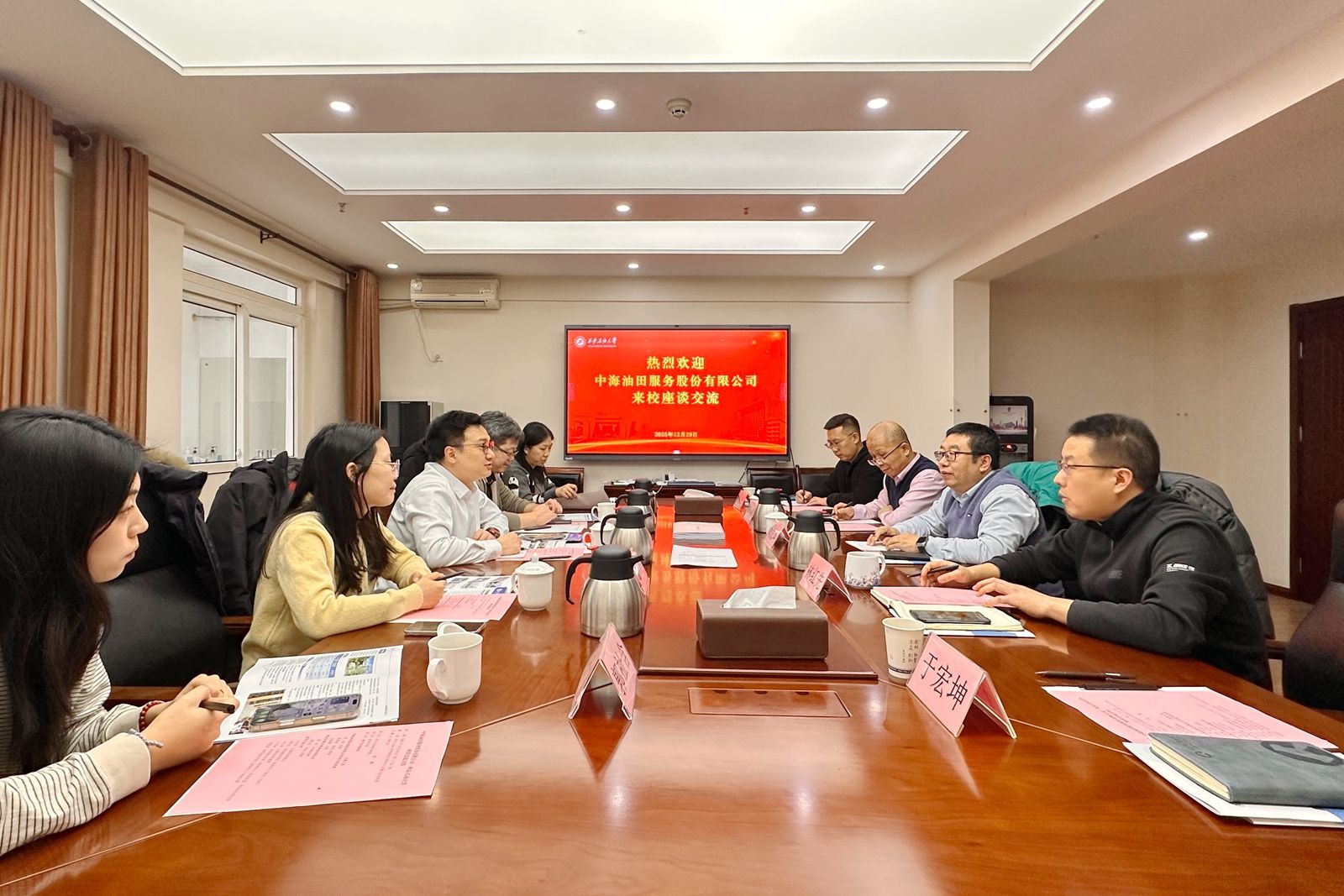 12月29日下午,中海油田服务股份有限公司(简称“中海油服”)一行5人来校走访交流。座谈会在学校明德校区培训中心北楼举行。中海油服科技与信息部经理陈涛、首席工程师楚西超等,我校计算机学院、继续教育学院(培训中心)主要负责人、相关学科专业负责人参加交流。双方就油田企业数字化转型等前沿技术及员工能力提升培训展开深入交流。座谈会由继续教育学院(培训中心)院长(主任)林红先主持。