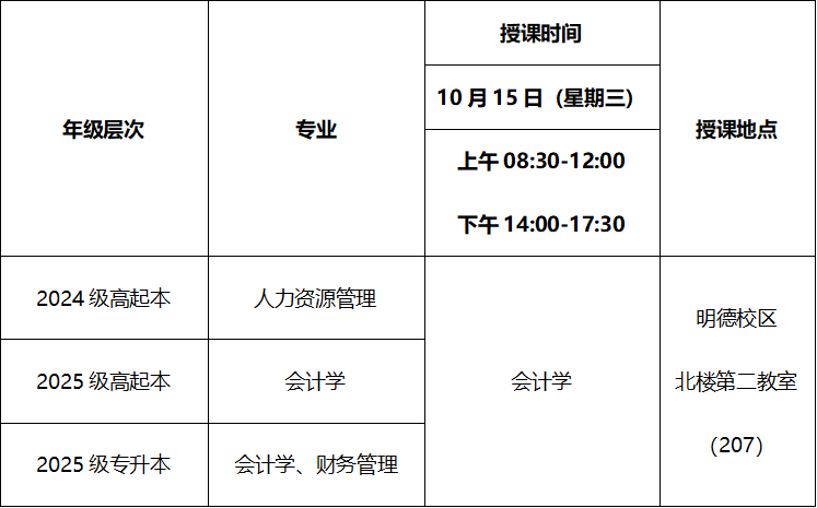 2025年秋季学期第四次(10月15日)线下教学课程表