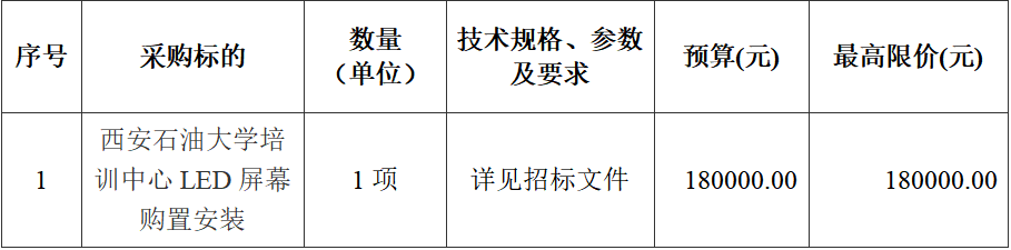 西安石油大学培训中心LED屏幕购置安装项目的潜在供应商应在西安石油大学培训中心获取招标文件,并于2025年11月10日下午15:00时(北京时间)前提交响应文件。