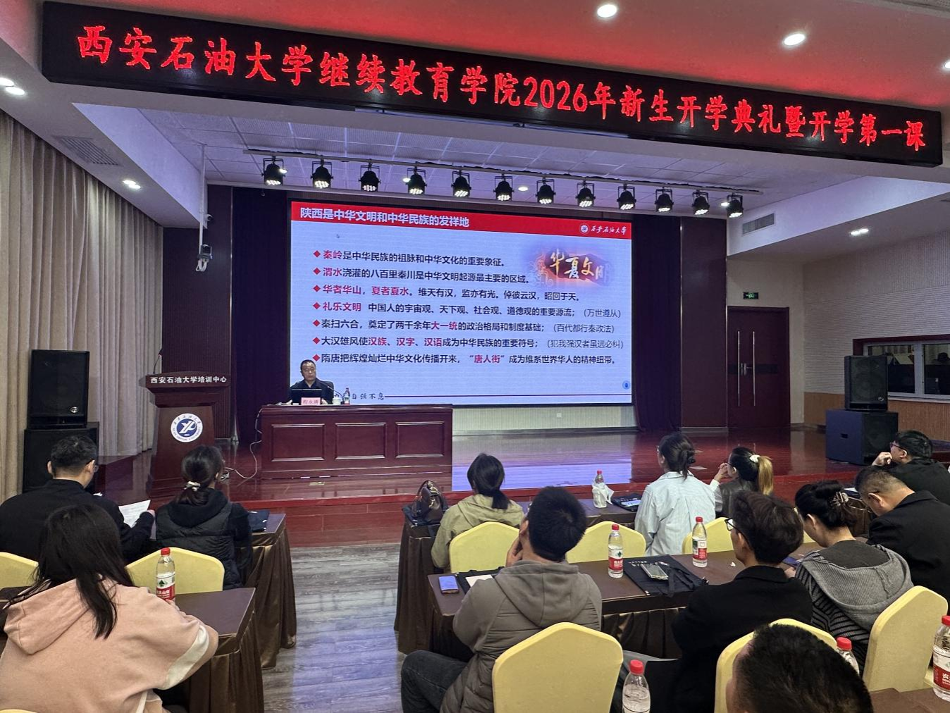 典礼在庄严的国歌声中拉开帷幕,张骁勇代表学校对全体新生表示热烈欢迎和诚挚祝贺,并介绍了学校的历史沿革、办学特色、发展成就、继续教育发展历程及专业特色。他指出,同学们怀揣求知的渴望与成长的期许,带着工作经验与人生阅历重返校园,这份选择尤为珍贵,既是对学校办学实力的认可,更是对自我提升、终身学习的坚定追求。他对全体新生提出四点希望和要求:一是坚定信念,厚植家国情怀,做有担当的西石大;二是勤学善思,坚持终身学习,做有本领的奋进者;三是求真务实,勇于开拓创新,做有闯劲的实干家;四是修身立德,严守纪律规矩,做有品行的追梦人。他勉励同学们珍惜学习机会、践行使命担当,以梦想为帆、以奋斗为桨,在知识的海洋中奋勇拼搏,在人生的道路上绽放光彩,用奋斗书写无愧于时代、无愧于青春的壮丽篇章!
