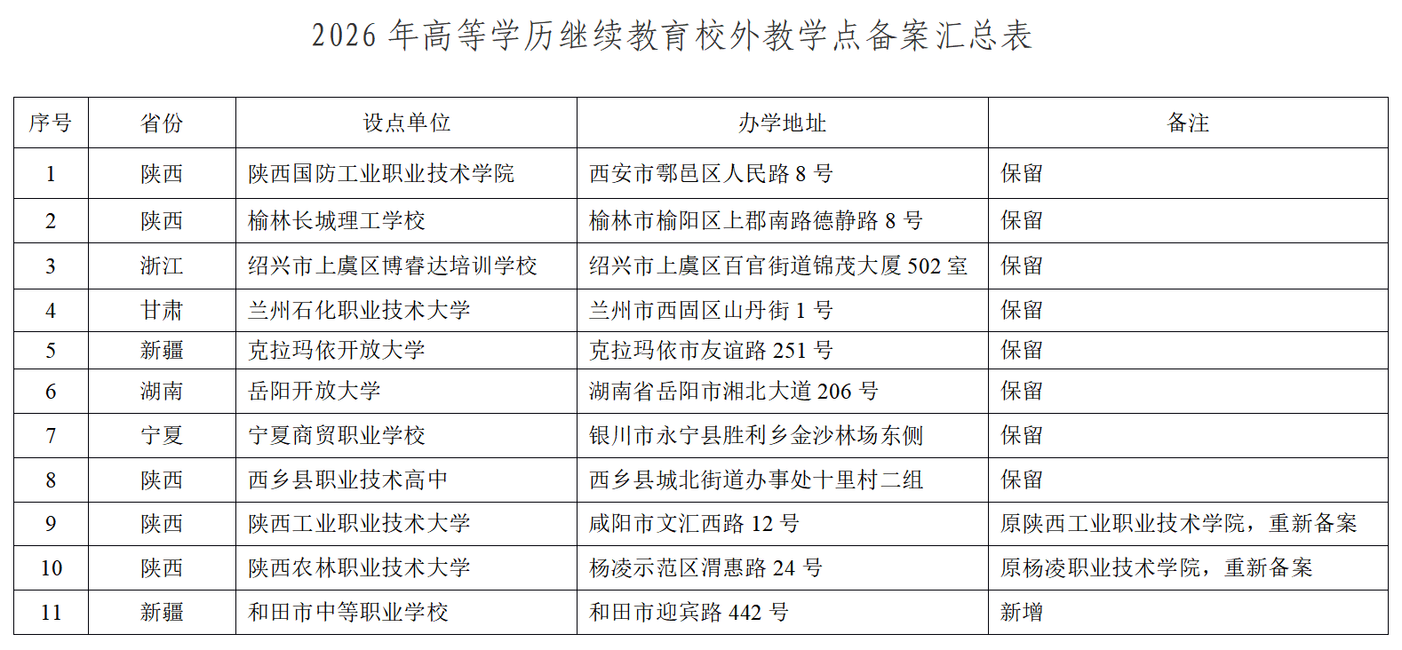 根据《教育部办公厅关于做好2026年度高等学历继续教育专业和校外教学点设置与管理工作的通知》(教职成厅函〔2026〕8号)、《陕西省教育厅办公室关于做好2026年度高等学历继续教育专业和校外教学点设置与管理工作的通知》(陕教高办〔2026〕4号)要求,经学校研究决定,同意新增和田市中等职业技术学校校外教学点,保留陕西国防工业职业技术学院等8校外教学点,陕西工业职业技术大学和陕西农林职业技术大学因升大学更名重新备案。现面向社会予以公示。如有异议,请在公示期内来电反映。